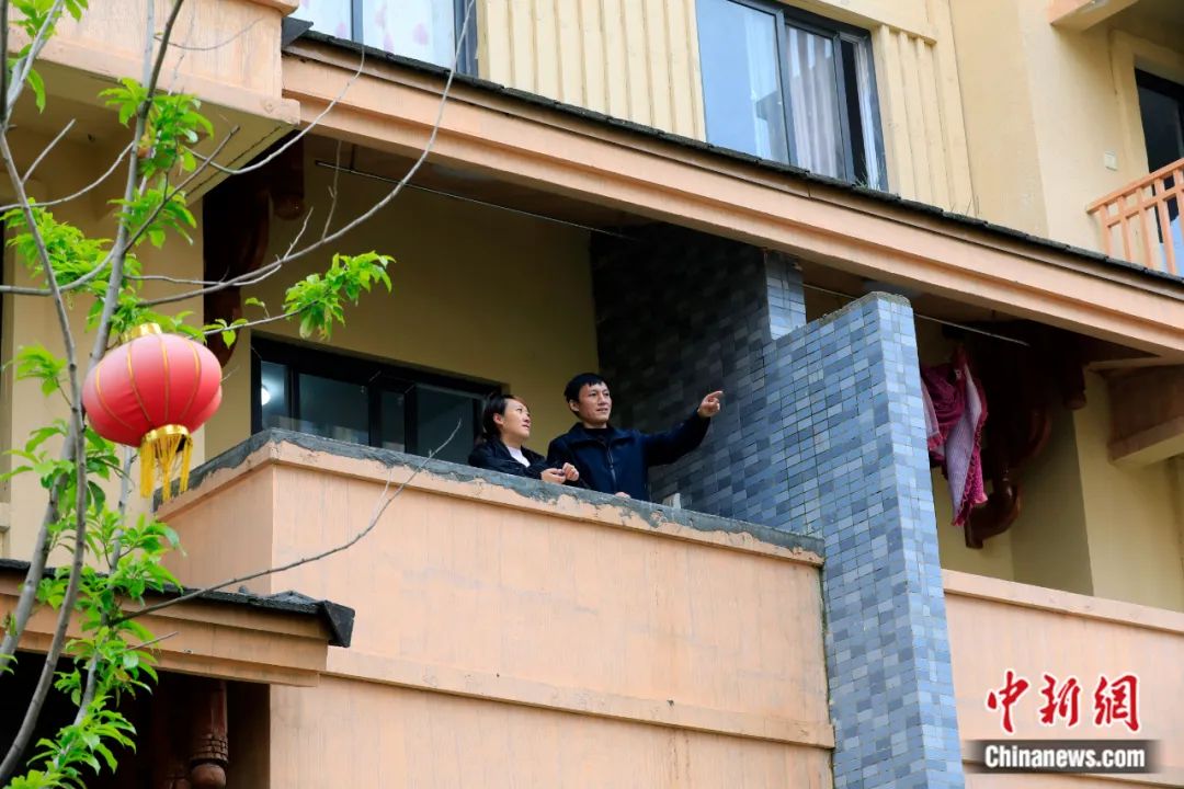 四川昭覺,位于海拔1400多米的懸崖之上的阿土列爾村享受到易地扶貧搬遷政策,村民某色爾布(右)與妻子在新居的陽臺上眺望。王磊 攝