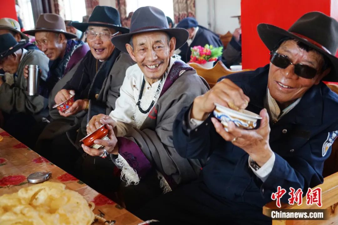青海省玉樹藏族自治州治多縣幸福敬老院,老人們吃早飯“糌粑”。該縣特困老人集中供養(yǎng)入住率達100%。馬銘言 攝