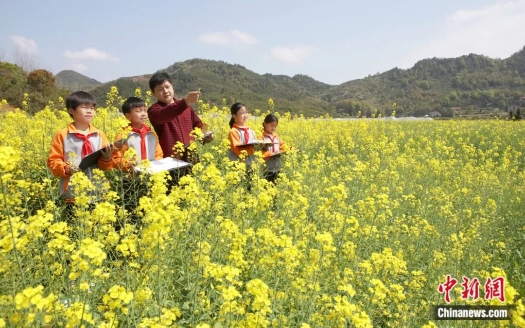 江西省宜春市袁州區(qū)水江鎮(zhèn)中心小學老師帶領學生們正在油菜花海中寫生秀美鄉(xiāng)村。鄒忠 攝