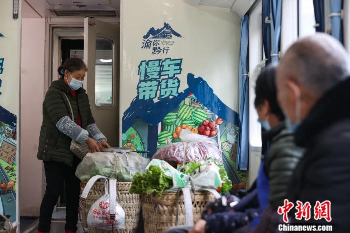 貴州桐梓,菜農(nóng)在5630次“慢火車”的“帶貨車廂”內整理蔬菜。往返于遵義市與重慶市的5629/30次公益性“慢火車”最低票價6元人民幣,是當?shù)卮迕癯鲂械闹匾煌üぞ?。瞿宏?攝