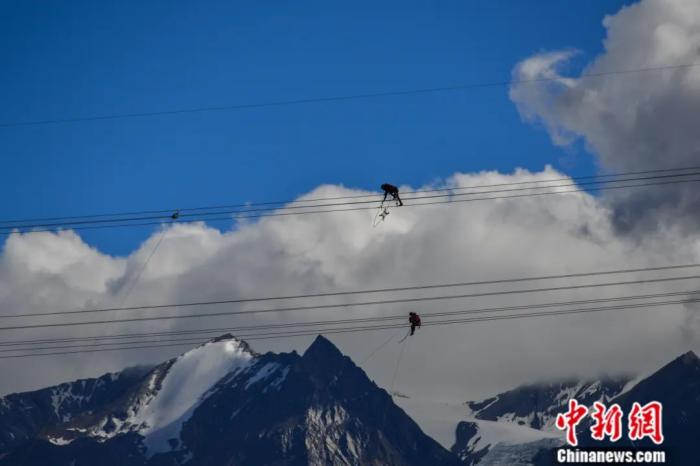2012年至2022年,西藏邁入統(tǒng)一電網(wǎng)時代。圖為西藏阿里聯(lián)網(wǎng)工程施工人員在日喀則希夏邦馬雪山附近進行走線作業(yè)。江飛波 攝