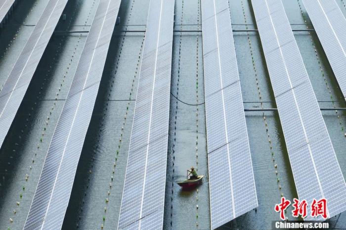 江蘇常州,航拍武進區(qū)前黃鎮(zhèn)漁光互補光伏發(fā)電基地。該基地實現(xiàn)了“上面發(fā)電、下面養(yǎng)殖,科學發(fā)展,綜合利用”的漁光一體模式。泱波 攝