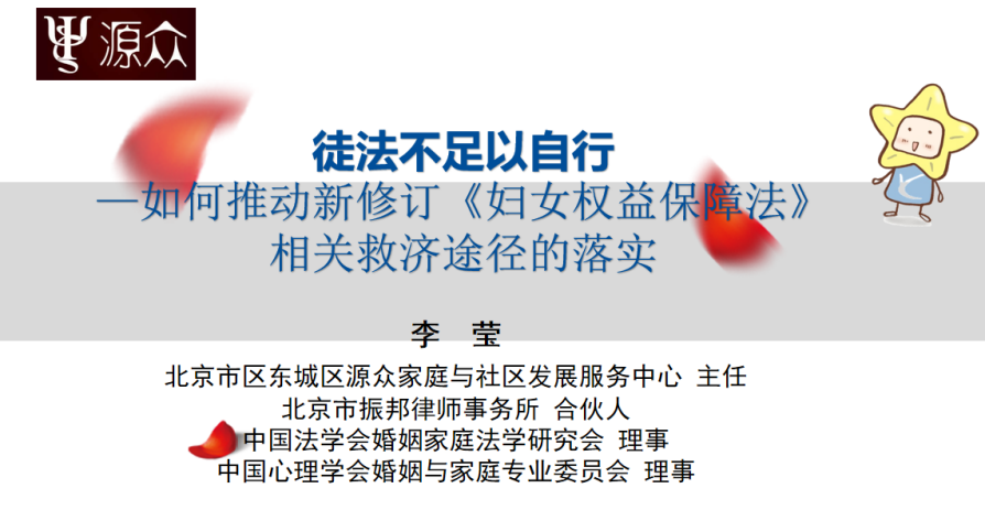源眾家庭與社區(qū)發(fā)展服務(wù)中心主任李瑩律師講授的主題是《徒法不足以自行—如何推動(dòng)新修訂的〈婦女權(quán)益保障法〉相關(guān)救濟(jì)途徑的落實(shí)》。李律師從新修訂的《婦女權(quán)益保障法》救濟(jì)措施談起,分享了源眾目前的實(shí)踐探索和挑戰(zhàn)。李瑩律師還介紹了源眾下一步的主要推動(dòng)方向,期待深入落實(shí)《婦女權(quán)益保障法》的救濟(jì)措施。