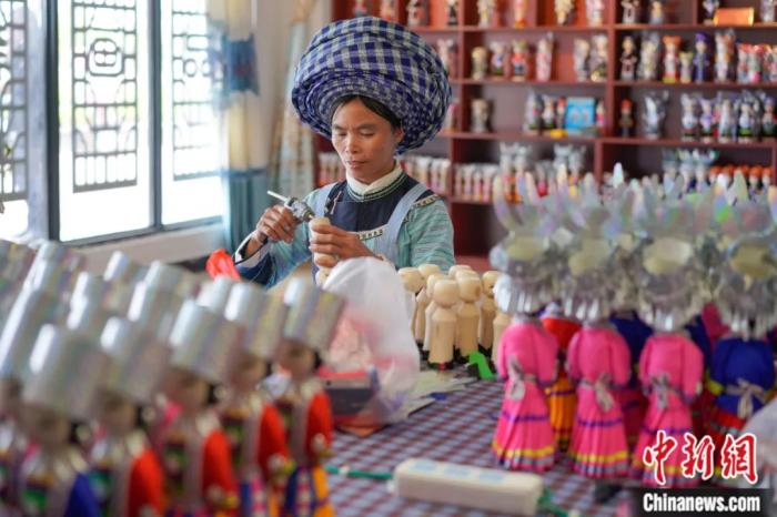 2019年,貴州鎮(zhèn)寧易地扶貧搬遷安置點景寧小區(qū)“錦繡計劃·巧手脫貧”示范基地內(nèi),45歲的布依族婦女伍夢芬制作工藝品木娃。賀俊怡 攝
