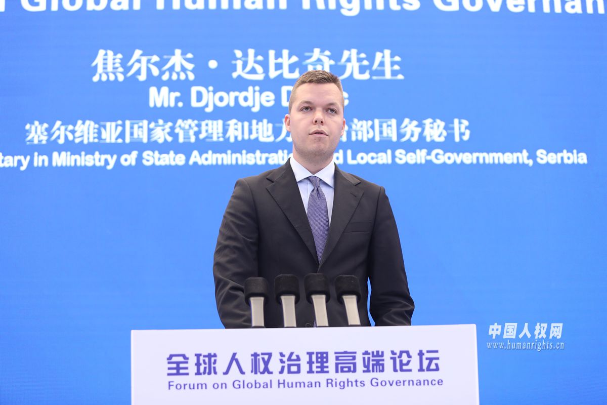 6月14日-15日,全球人權(quán)治理高端論壇在北京舉辦。圖為塞爾維亞國(guó)家管理和地方自治部國(guó)務(wù)秘書焦?fàn)柦?middot;達(dá)比奇作大會(huì)發(fā)言。攝影:欒海軍