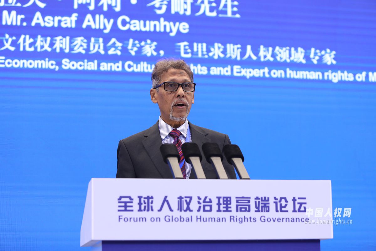 6月14日-15日,全球人權(quán)治理高端論壇在北京舉辦。圖為聯(lián)合國經(jīng)濟(jì)、社會及文化權(quán)利委員會專家,毛里求斯人權(quán)領(lǐng)域?qū)<野⑺估?middot;阿利·考耐作大會發(fā)言。攝影:欒海軍