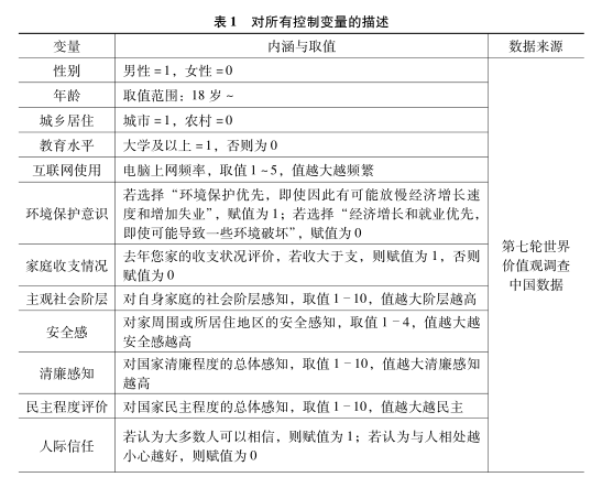 由于混淆因素的存在,直接比較不可行。本文從個體和省級兩個層面控制相關(guān)因素。在個體層面,本研究考慮了諸多控制變量,以消除個體差異性對分析結(jié)果的影響。具體而言,這些個體因素包括性別、年齡、教育水平、互聯(lián)網(wǎng)使用、環(huán)境意識、家庭收支情況、社會階層感知、安全感、清廉感知以及民主程度評價。數(shù)據(jù)均來源于第七輪世界價值觀調(diào)查中國數(shù)據(jù)。在省級層面,本研究也納入三個變量反映區(qū)域差異性。第一,2012年各省份人權(quán)尊重度感知的平均水平?;诘诹喪澜鐑r值觀調(diào)查數(shù)據(jù)求均值,并參考應(yīng)變量的賦值方法,將平均得分至少3分賦值為1,表明身處這些區(qū)域的公眾普遍感受到人權(quán)受到充分尊重,反之則意味著存在欠缺,賦值為0。第二,經(jīng)濟發(fā)展水平,采用各省份2012-2017年人均GDP均值。第三,城市化水平,采用城鎮(zhèn)人口占總?cè)丝诘谋戎赜枰院饬?。?jīng)濟增長與城市化不僅推動著中國社會的結(jié)構(gòu)轉(zhuǎn)型,也在重構(gòu)著社會公眾的價值觀,進而影響其如何感知社會現(xiàn)象。表1對所有控制變量的內(nèi)涵和取值進行了簡要描述。