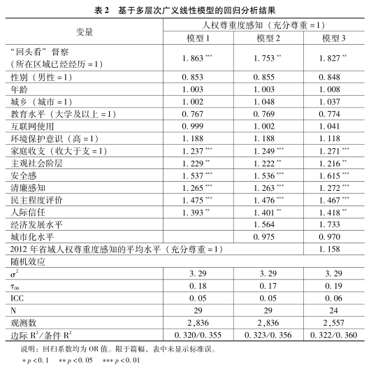 由于數(shù)據(jù)涉及兩個層次且應(yīng)變量為二分變量,本研究采用多層次廣義線性模型進行實證分析。在此模型中,省份作為隨機效應(yīng)被納入,用以控制人權(quán)尊重度感知在省份間的差異性。