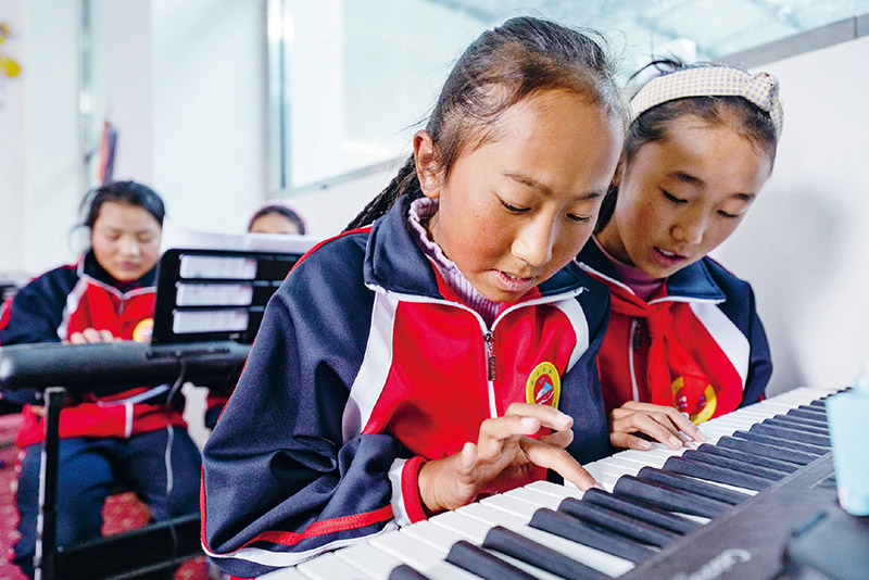 圖為2023年6月5日,在西藏日喀則定日縣扎西宗鄉(xiāng)完全小學(xué),四年級三班的旦增吉宗(前排左)正在和小伙伴上鋼琴課。鋼琴課是該校16個(gè)興趣班之一。為了滿足學(xué)生們的各種需求,學(xué)校設(shè)置了信息技術(shù)、美術(shù)、廣播、體育、舞蹈、手工等興趣班,促進(jìn)學(xué)生全面發(fā)展。 新華社記者 費(fèi)茂華/攝