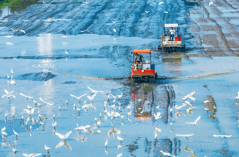 以當(dāng)代中國人權(quán)觀為指引,我國不斷加強(qiáng)環(huán)境權(quán)利保障力度,取得了顯著成效。圖為2023年7月2日,在安徽蕪湖弋江區(qū)義興村,農(nóng)民正駕駛拖拉機(jī)翻耕農(nóng)田,成群的鷺鳥伴隨著耕作的拖拉機(jī)翩翩起舞,構(gòu)成一幅美麗和諧的生態(tài)田園畫卷。 人民圖片 肖本祥/攝
