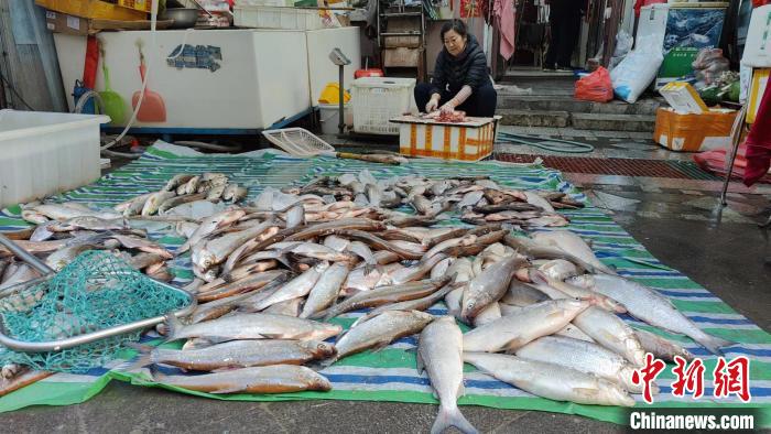“東極魚市”里魚類豐富,一家魚行老板在為顧客處理魚鱗。姜輝 攝