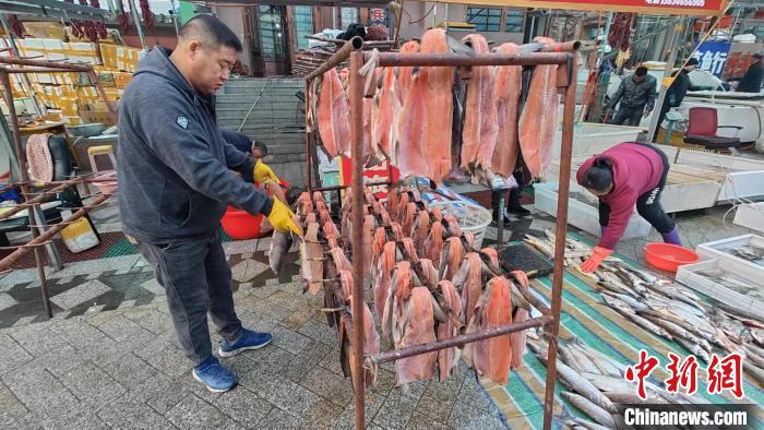 “東極魚市”里,一家魚行老板在制作大馬哈魚干。姜輝 攝