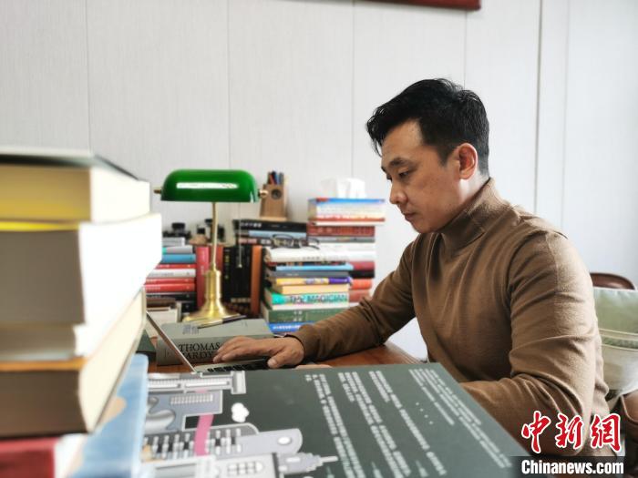 12月5日,索南才讓在自己位于青海省海北藏族自治州海晏縣的工作室內寫作。中新社記者 張?zhí)砀?攝