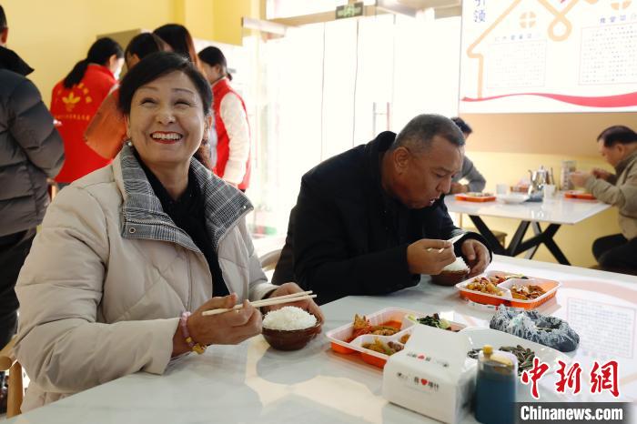 12月11日,在“草湖味道”社區(qū)長(zhǎng)者食堂用餐的老人?!≈行律缬浾?韓海丹 攝