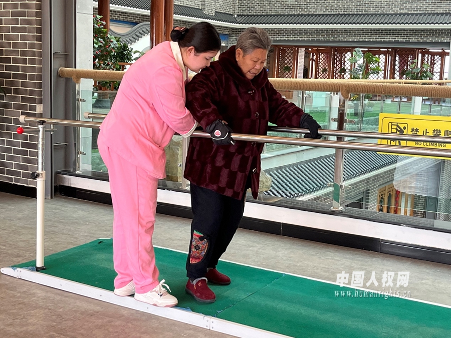粵康社會(huì)福利院一名護(hù)工正在幫助老人做康復(fù)訓(xùn)練。