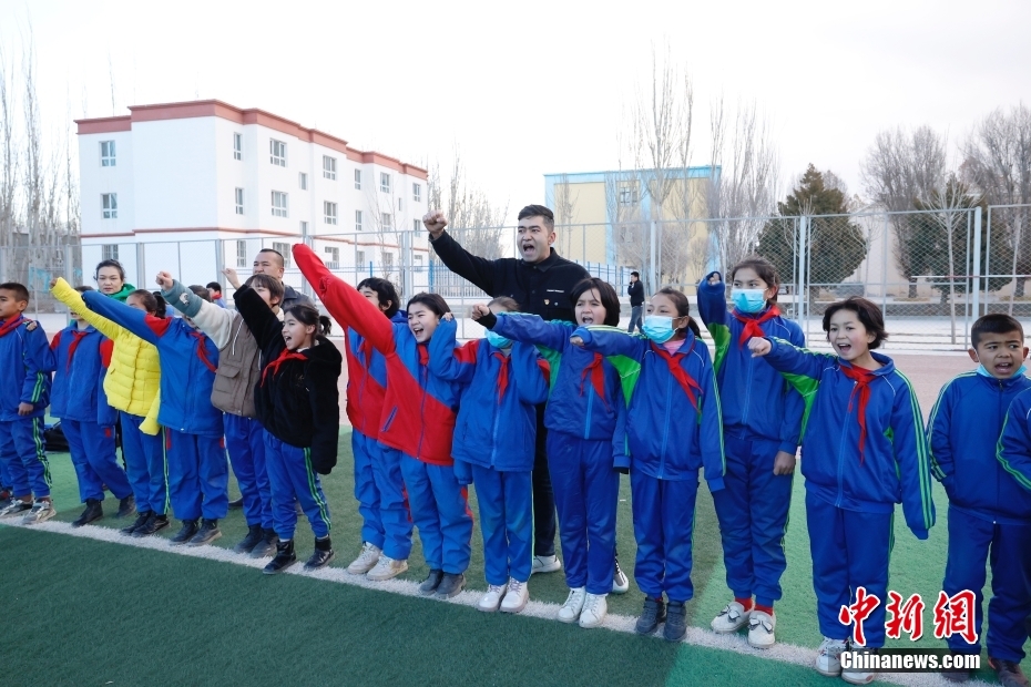 新疆很多人喜愛足球。在新疆阿圖什,人們更是驕傲于當(dāng)?shù)貪夂竦淖闱蚍諊土己玫娜罕娀A(chǔ)。13日,中新社記者來到阿圖什市上阿圖什鎮(zhèn)依克薩克小學(xué),一場鄉(xiāng)村小學(xué)間的足球賽正激烈進(jìn)行。圖為同學(xué)們在校長的帶領(lǐng)下為足球賽加油。中新社記者 韓海丹 攝