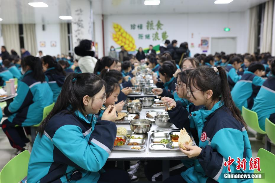 12月13日,新疆維吾爾自治區(qū)哈密市豫哈實(shí)驗(yàn)學(xué)校,學(xué)生們在食堂就餐。中新社記者 楊可佳 攝
