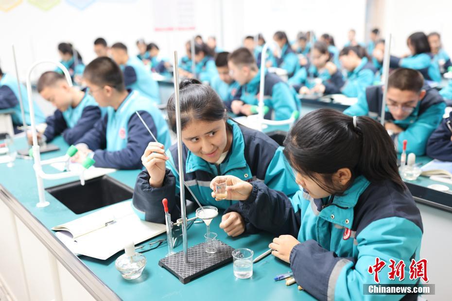 12月13日,新疆維吾爾自治區(qū)哈密市豫哈實(shí)驗(yàn)學(xué)校,學(xué)生們在上化學(xué)課。中新社記者 楊可佳 攝