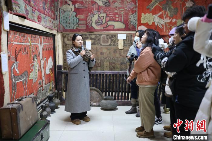 12月16日,凱麗比努爾·庫爾班正在庫爾班民俗博物館內(nèi)講解手工地毯的故事。中新社記者 楊可佳 攝