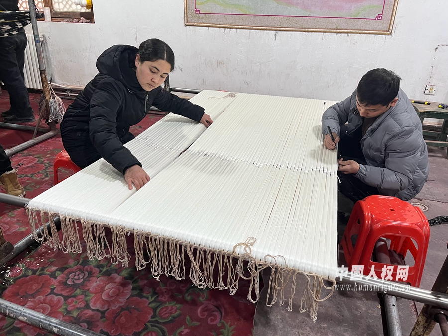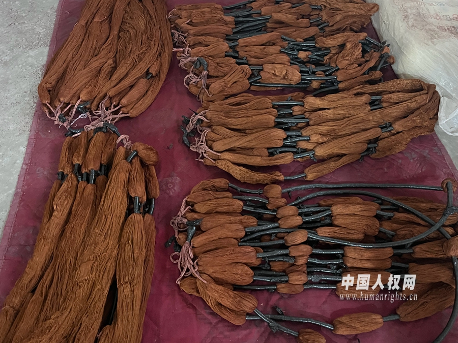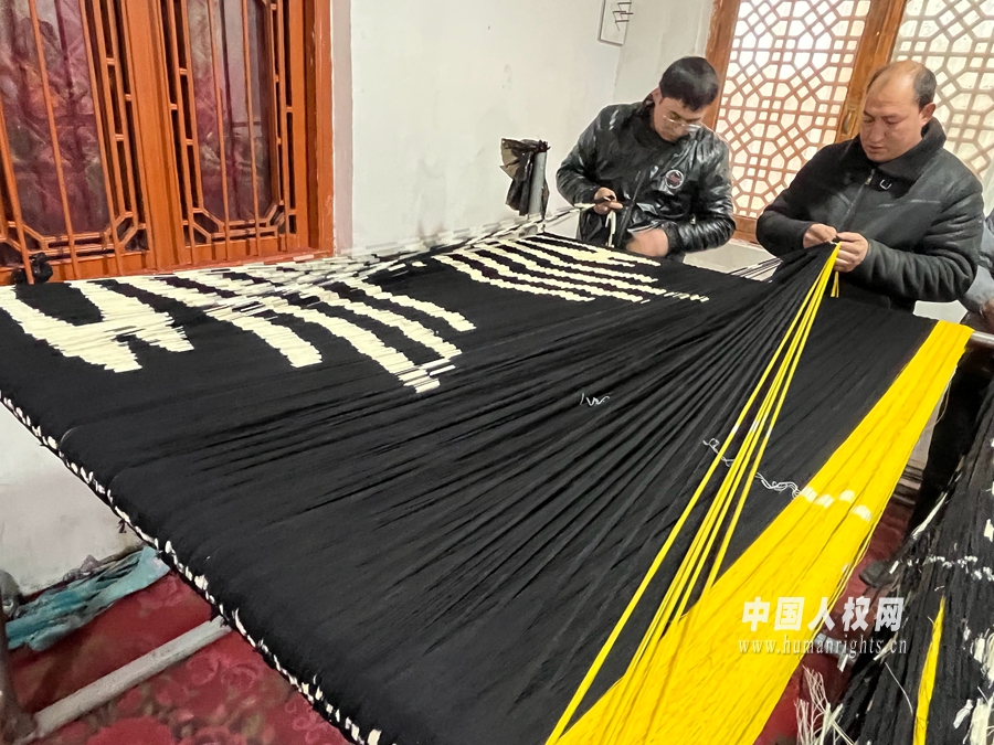 工人正在進行捆絲,將合并好的絲線按照傳統(tǒng)的花色圖案排列。