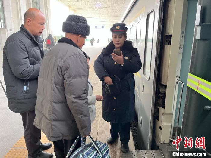 12月19日,5818次列車的乘務(wù)員米熱阿依·買沙吾爾正在檢票。中新社記者 勉征 攝