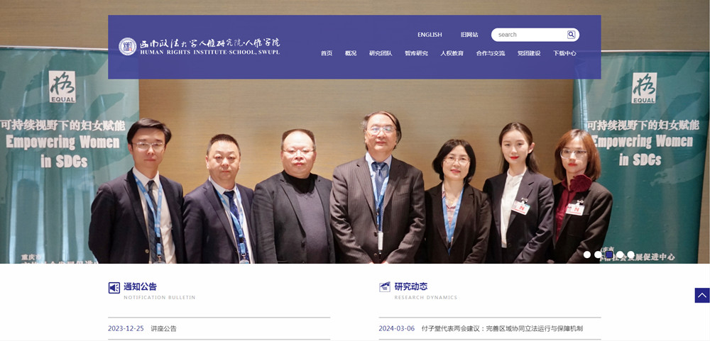 西南政法大學(xué)人權(quán)研究院(人權(quán)學(xué)院)是集人權(quán)智庫建設(shè)、人權(quán)學(xué)科建設(shè)、人權(quán)人才培養(yǎng)多位一體的實體化研究機(jī)構(gòu)。自2011年成立以來,以公共政策和戰(zhàn)略研究咨詢?yōu)橹鞴シ较?,積極服務(wù)國家人權(quán)戰(zhàn)略。經(jīng)過十余年建設(shè),在人權(quán)資政建言、人權(quán)理論與實踐研究、人權(quán)國際交流與合作、人權(quán)話語傳播、人權(quán)人才培養(yǎng)等方面居國內(nèi)領(lǐng)先地位,具備了一定的國際影響力。2022年2月,按照重慶市委關(guān)于“人權(quán)研究院”與“人權(quán)學(xué)院”融合發(fā)展的要求,學(xué)校以人權(quán)研究院為依托組建了人權(quán)學(xué)院,成為全國首個在高校設(shè)立的人權(quán)學(xué)院(以下簡稱“人權(quán)院”)。