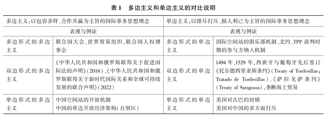 根據(jù)從行為本質和思想理念角度區(qū)分多邊主義和單邊主義的標準,可以對多邊主義和單邊主義進行簡單對比說明(如表1所示)。