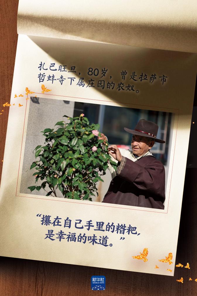 西藏民主改革前,扎巴旺旦一家九口每天的果腹之物,只有小孩巴掌大的一碗糌粑湯。那碗湯,稀得可以照人影。“若你未曾見過鏡子,不妨瞧瞧阿佳(姐姐)手中那碗清湯。”老人唱起兒時(shí)的歌謠。