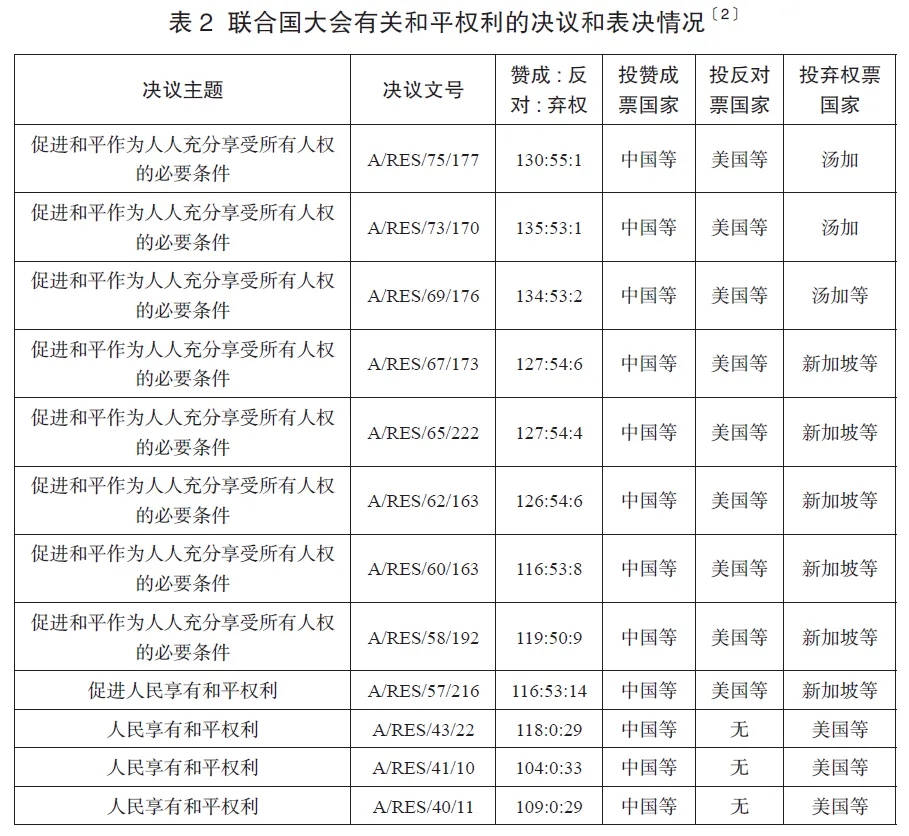 1985年至1988年,聯(lián)合國大會通過了3個關(guān)于“人民享有和平權(quán)利”的決議,中國等100多個國家投了贊成票,而美國等少數(shù)國家投了棄權(quán)票。在聯(lián)合國大會第五十七屆會議關(guān)于“促進人民享有和平權(quán)利”決議的表決中,中國等116個國家投了贊成票,而美國等53個國家投了反對票。2003—2020年,聯(lián)合國大會通過了8個關(guān)于“促進和平作為人人充分享受所有人權(quán)的必要條件”的決議,中國等大多數(shù)國家都投了贊成票,而美國等少數(shù)國家卻投了反對票(見表2)。