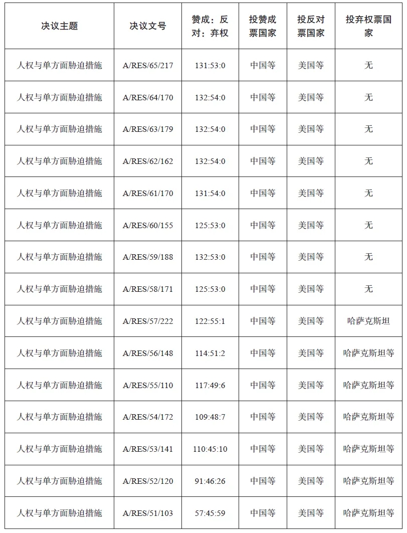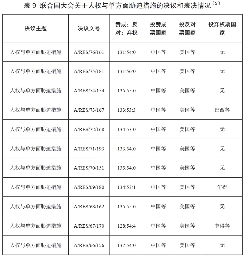 1996年至2021年,聯(lián)合國大會通過了26個關(guān)于“人權(quán)與單方面脅迫措施” 決議,中國等大多數(shù)國家投了贊成票,美國等國家投了反對票(見表9)。