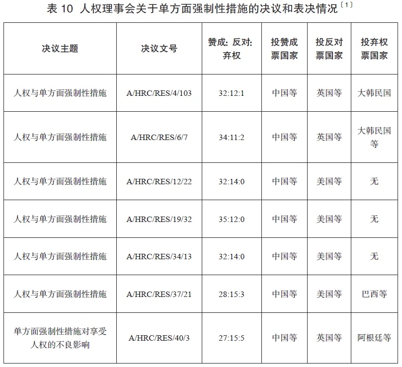 在聯(lián)合國人權(quán)理事會通過“人權(quán)與單方面強制性措施”和“單方面強制性措施對享有人權(quán)的不良影響”決議時,中國等大多數(shù)國家投了贊成票,美國等國家投了反對票(見表10)。