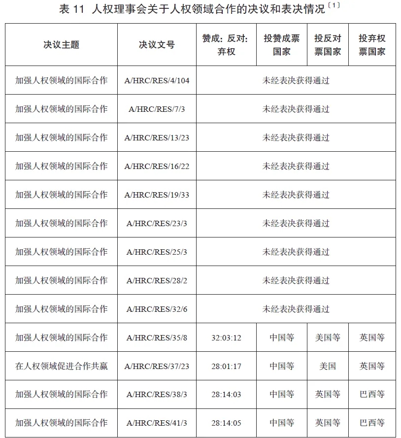 2007年至2019年,聯(lián)合國人權(quán)理事會通過了12個關(guān)于“加強人權(quán)領(lǐng)域的國際合作”和1個關(guān)于“在人權(quán)領(lǐng)域促進合作共贏”的決議,其中有9次是未經(jīng)表決通過,有4次是表決通過。在表決通過的4次決議中,中國全部投了贊成票,英國、美國等國家投了反對票(見表11)。