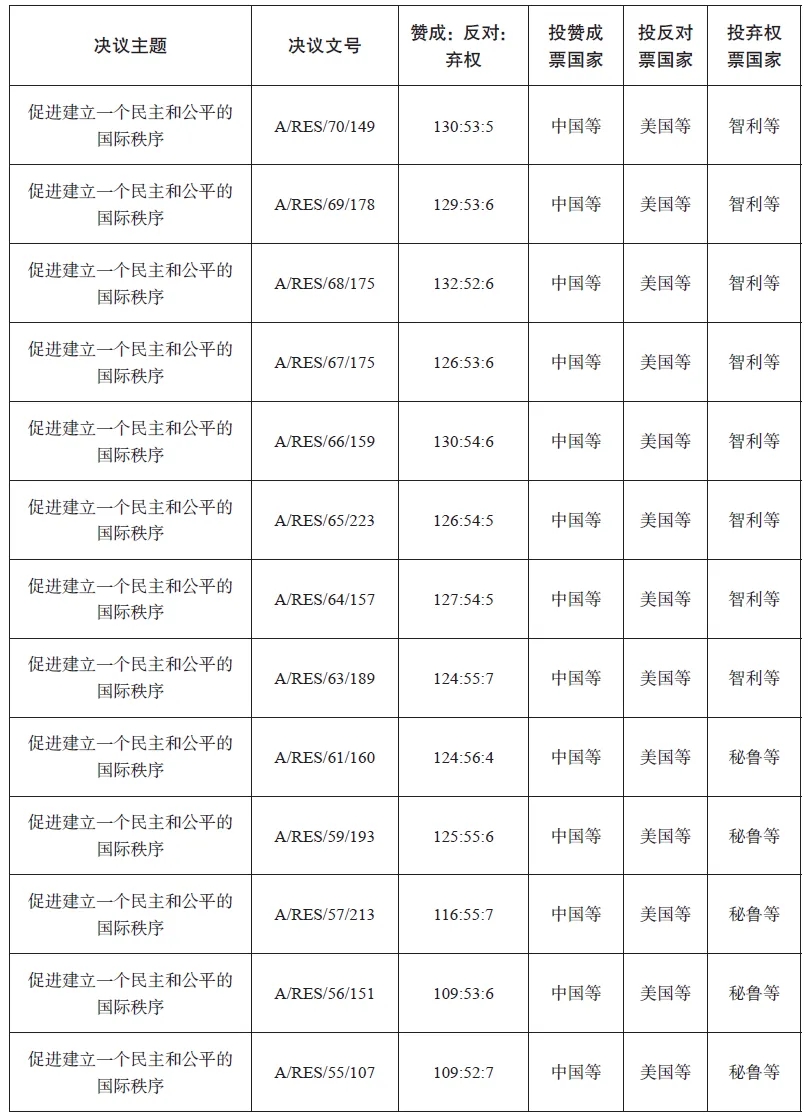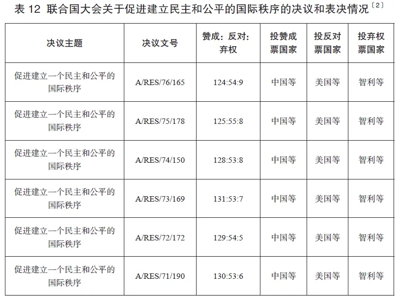 2000年至2021年,聯(lián)合國大會共通過19個關(guān)于“促進建立一個民主和公平的國際秩序”的決議,中國全部投了贊成票,而美國都投了反對票(見表12)。