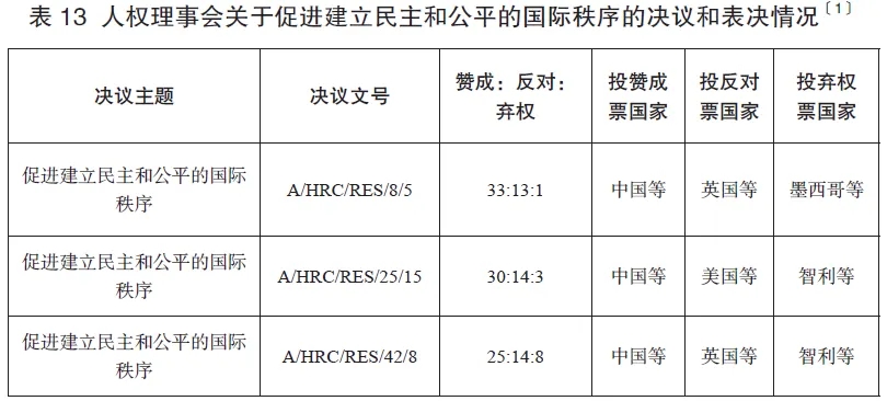 聯(lián)合國人權(quán)理事會在通過“促進建立民主和公平的國際秩序”決議時,中國投了贊成票,而美國投了反對票(見表13)。