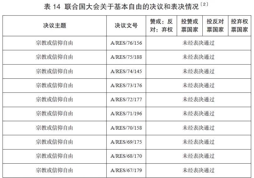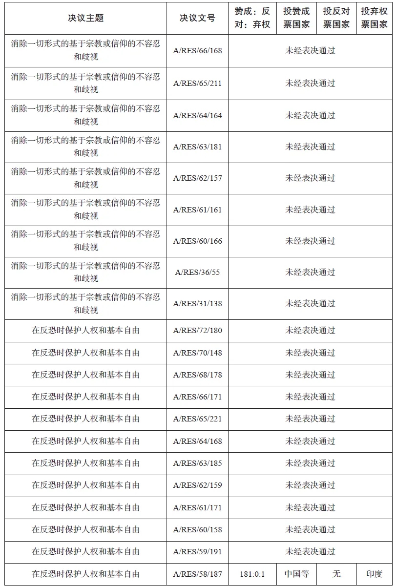 1976年至2011年,聯(lián)合國大會未經(jīng)表決通過9個關(guān)于“消除一切形式的基于宗教或信仰的不容忍和歧視”決議。2012年至2021年,聯(lián)合國大會未經(jīng)表決通過了10個關(guān)于“宗教或信仰自由”決議。2003年至2017年,聯(lián)合國大會通過了12個關(guān)于“在反恐時保護人權(quán)和基本自由”決議,除了2003年出現(xiàn)了印度一票棄權(quán),其他11個決議都是未經(jīng)表決通過。