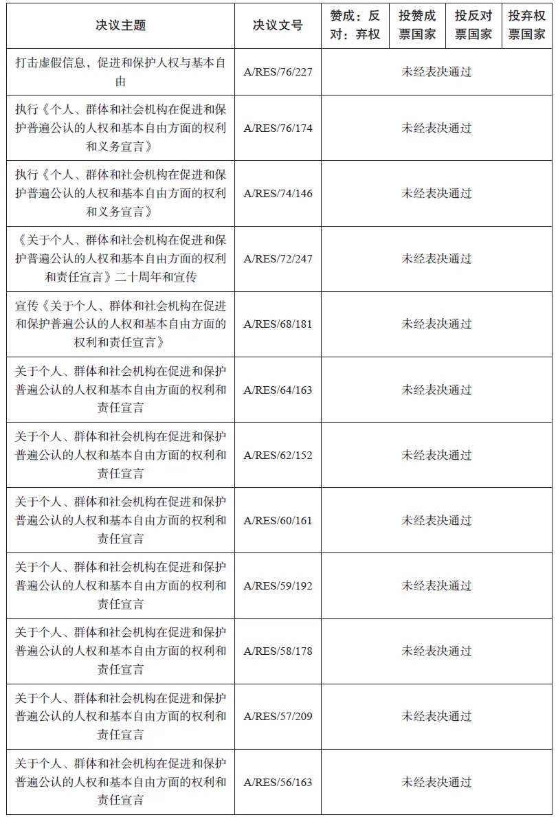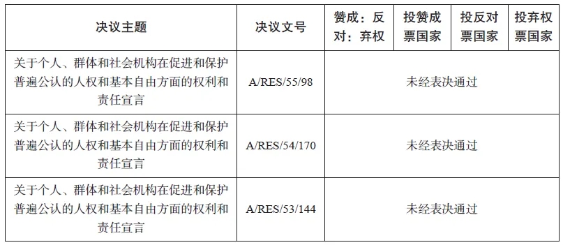 1998年至2021年,聯(lián)合國大會未經(jīng)表決通過了10個“關(guān)于個人、群體和社會機構(gòu)在促進和保護普遍公認的人權(quán)和基本自由方面的權(quán)利和責(zé)任宣言”決議、 2個“執(zhí)行《個人、群體和社會機構(gòu)在促進和保護普遍公認的人權(quán)和基本自由方面的權(quán)利和義務(wù)宣言》”、1個“《關(guān)于個人、群體和社會機構(gòu)在促進和保護普遍公認的人權(quán)和基本自由方面的權(quán)利和責(zé)任宣言》二十周年和宣傳”決議和1個 “宣傳《關(guān)于個人、群體和社會機構(gòu)在促進和保護普遍公認的人權(quán)和基本自由方面的權(quán)利和責(zé)任宣言》”決議。2021年,聯(lián)合國大會還未經(jīng)表決通過了“打擊虛假信息,促進和保護人權(quán)與基本自由”決議。中國對這些決議都持支持立場(見表14)。但中國也對個別相關(guān)決議投了棄權(quán)票。如在1982年聯(lián)合國大會第三十七屆會議上,蘇聯(lián)等38個國家對關(guān)于“進一步促進及保護人權(quán)和基本自由” 決議投了反對票,中國等20個國家投了棄權(quán)票。在2018年聯(lián)合國大會第七十三屆會議上,中國等35個國家對關(guān)于“促進及保護人權(quán)和基本自由,包括和平集會權(quán)和結(jié)社自由權(quán)”決議投了棄權(quán)票。