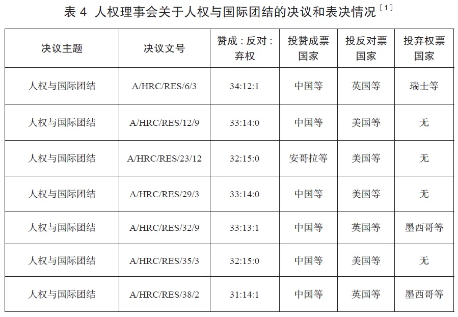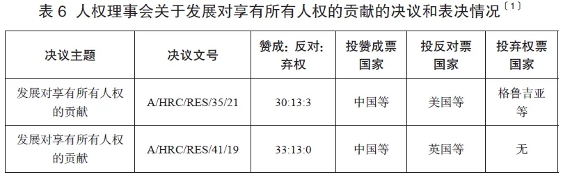 2017年,聯(lián)合國人權(quán)理事會通過了中國提出的“發(fā)展對享有所有人權(quán)的貢獻” 決議草案。2019年7月12日,聯(lián)合國人權(quán)理事會再次通過中國提交的“發(fā)展對享有所有人權(quán)的貢獻”決議,重申發(fā)展對享有所有人權(quán)具有重大貢獻,實現(xiàn)人民對美好生活的向往是各國的優(yōu)先任務(wù),呼吁各國實現(xiàn)以人民為中心的發(fā)展,在人民中尋找發(fā)展動力,依靠人民推動發(fā)展,使發(fā)展造福人民,呼吁各國推進可持續(xù)發(fā)展,加強發(fā)展和消除貧困的國際合作(見表6)。