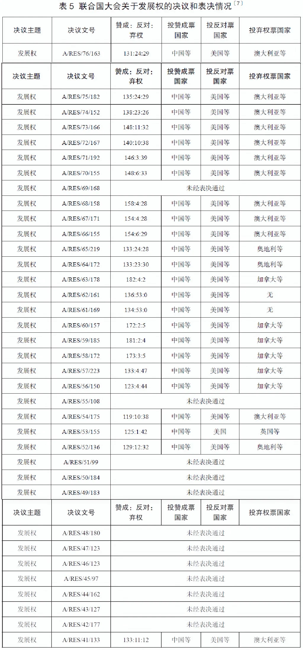 1986年至2021年,聯(lián)合國大會每年都會通過關(guān)于“發(fā)展權(quán)”的決議。其中有12個決議未經(jīng)表決獲得通過,24個決議表決通過。在表決通過的關(guān)于“發(fā)展權(quán)” 的決議中,中國都投了贊成票,而美國都投了反對票(見表5)。