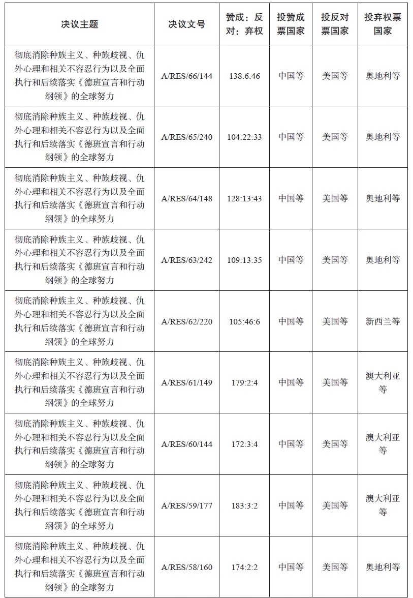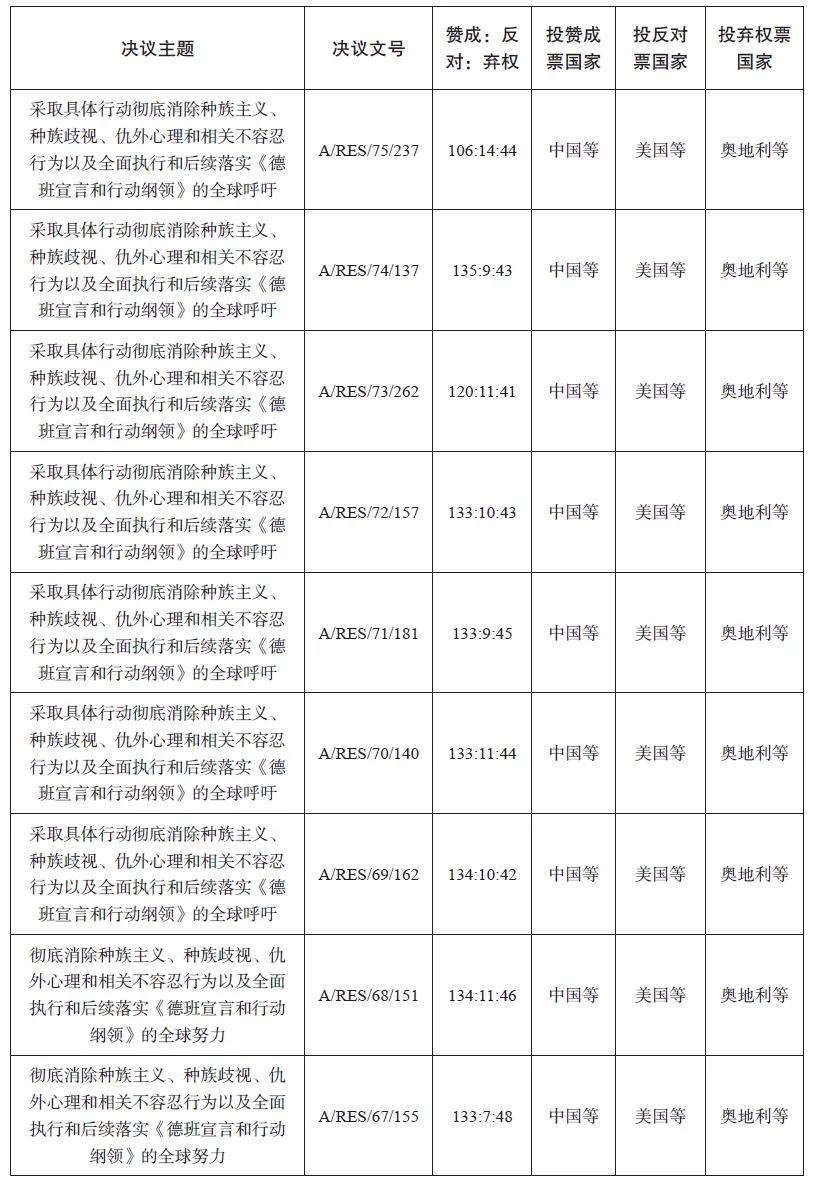 2003年至2021年,聯(lián)合國大會通過了8個“采取具體行動徹底消除種族主義、種族歧視、仇外心理和相關(guān)不容忍行為以及全面執(zhí)行和后續(xù)落實《德班宣言和行動綱領(lǐng)》的全球呼吁”決議和11個“徹底消除種族主義、種族歧視、仇外心理和相關(guān)不容忍行為以及全面執(zhí)行和后續(xù)落實《德班宣言和行動綱領(lǐng)》的全球努力”決議,中國等多數(shù)國家投了贊成票,美國等國家投了反對票(見表7)。