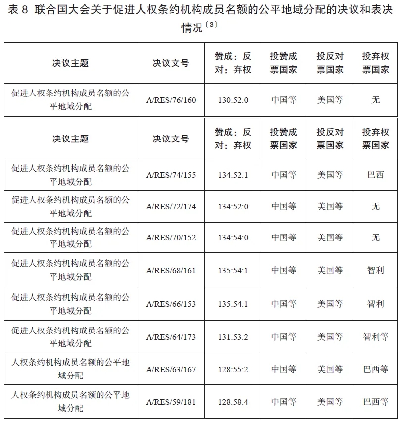 2004年至2021年,聯(lián)合國大會通過了7個關(guān)于“促進人權(quán)條約機構(gòu)成員名額的公平地域分配”決議和2個“人權(quán)條約機構(gòu)成員名額的公平地域分配”決議,中國等100多個國家投了贊成票,而美國等國家則投了反對票(見表8)。