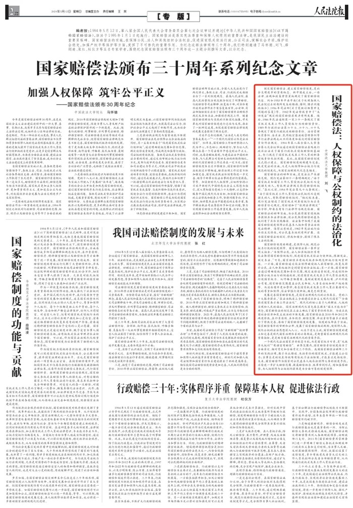 編者按:1994年5月12日,第八屆全國人民代表大會常務(wù)委員會第七次會議審議并通過《中華人民共和國國家賠償法》(以下簡稱國家賠償法),該法于1995年1月1日起施行。國家賠償法是落實(shí)憲法尊重和保障人權(quán)原則的重要法律,是我國民主法治建設(shè)的重要里程碑。國家賠償法的實(shí)施,在保障公民、法人和其他組織合法權(quán)益,促進(jìn)國家機(jī)關(guān)依法行政、公正司法,緩解社會矛盾,維護(hù)社會穩(wěn)定,加強(qiáng)產(chǎn)權(quán)平等保護(hù)等方面,發(fā)揮了不可替代的重要作用。為紀(jì)念這部法律頒布三十周年,我們特別邀請了馬懷德、劉飛、薛剛凌、張紅、杜儀方等五名專家學(xué)者,圍繞紀(jì)念國家賠償法頒布三十周年這一主題分別撰寫文章,以示紀(jì)念。