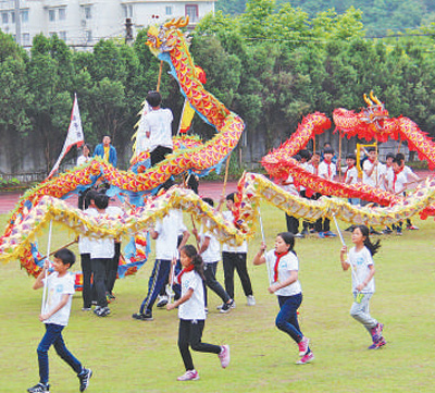 操場上,學(xué)生們拿起色彩各異的舞龍道具,分成兩隊(duì)一字排開,兩條長龍隨之舞動起來。伴隨著歡聲笑語,大伙一起奔跑、跳躍……在浙江省樂清市北白象鎮(zhèn)茗西學(xué)校,舞龍課是孩子們最期待的體育課。