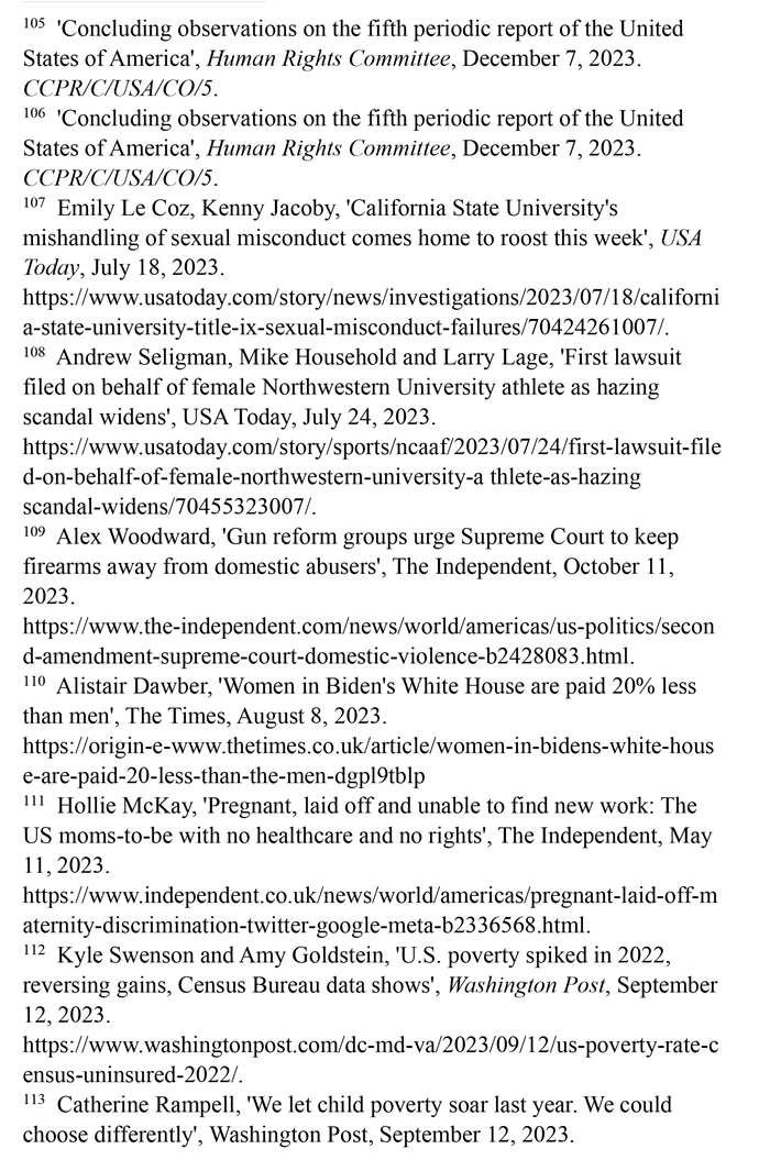 美國憲法迄今沒有禁止性別歧視的規(guī)定。職場性別歧視嚴重,男女收入差距擴大。婦女的生命權(quán)和健康權(quán)保障不足。孕產(chǎn)婦死亡率持續(xù)高居發(fā)達國家之首,禁止墮胎嚴重損害婦女生殖權(quán)利和健康權(quán)。職場、校園等多領域的性暴力層出不窮。兒童的生存權(quán)和發(fā)展權(quán)堪憂。兒童貧困人口激增,大量兒童醫(yī)療保險被取消,兒童健康權(quán)受到嚴重威脅。