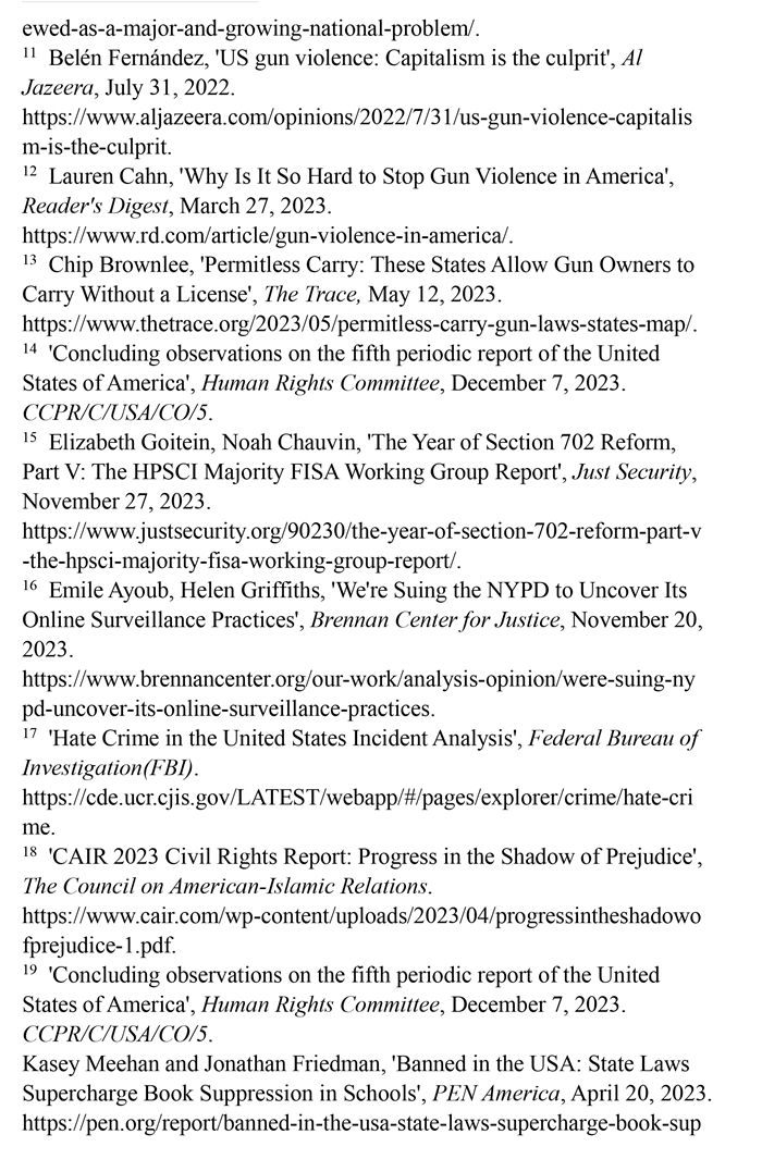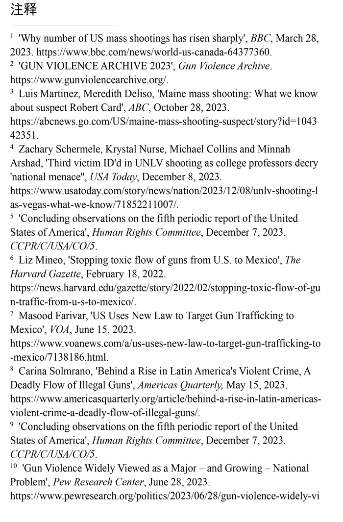 槍支暴力造成慘痛生命代價。數(shù)據(jù)顯示,美國所有類型的槍支暴力事件都呈上升趨勢。(注1)根據(jù)“槍支暴力檔案”網(wǎng)站統(tǒng)計的數(shù)據(jù),2023年美國至少發(fā)生了654起大規(guī)模槍擊事件。槍支暴力導致近4.3萬人死亡,平均每天死亡117人。(注2)例如,美國廣播公司新聞網(wǎng)站2023年10月28日報道,緬因州發(fā)生大規(guī)模槍擊事件,造成至少18人死亡,13人受傷。(注3)《今日美國報》網(wǎng)站2023年12月6日報道,拉斯維加斯3名大學教授被一名前同事槍殺。美國大學教授協(xié)會主席艾琳·馬爾維稱,槍支暴力是“不可接受的國家威脅”,敦促美國政府進行槍支政策改革。(注4)美國與槍支有關(guān)的傷亡人數(shù)激增,引發(fā)聯(lián)合國人權(quán)事務委員會的嚴重關(guān)切。(注5)