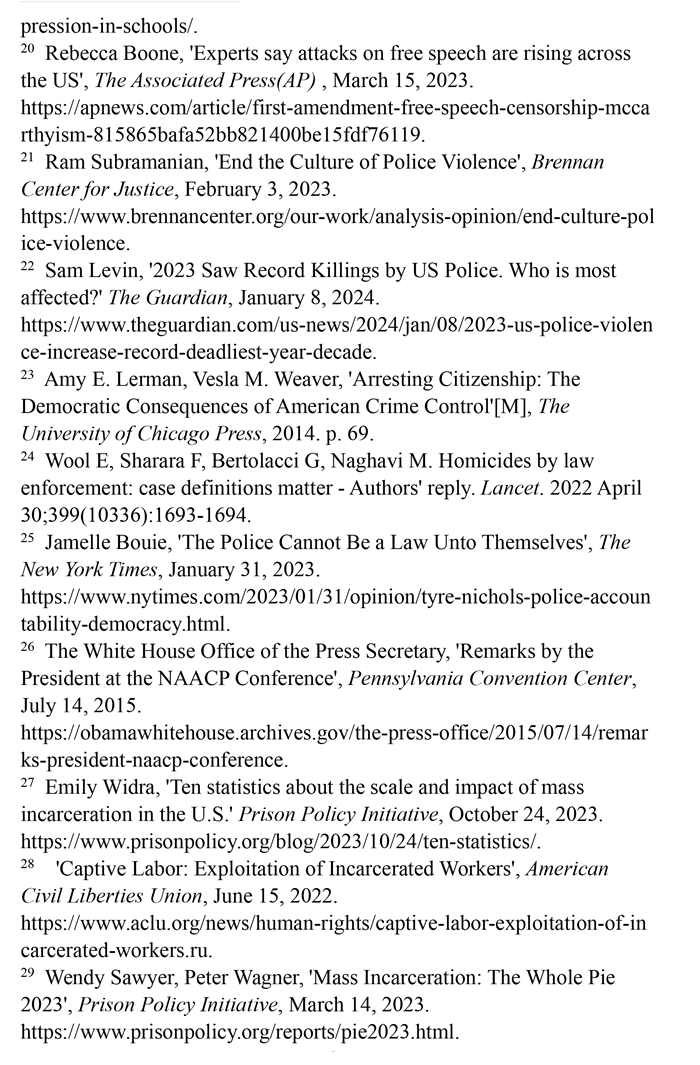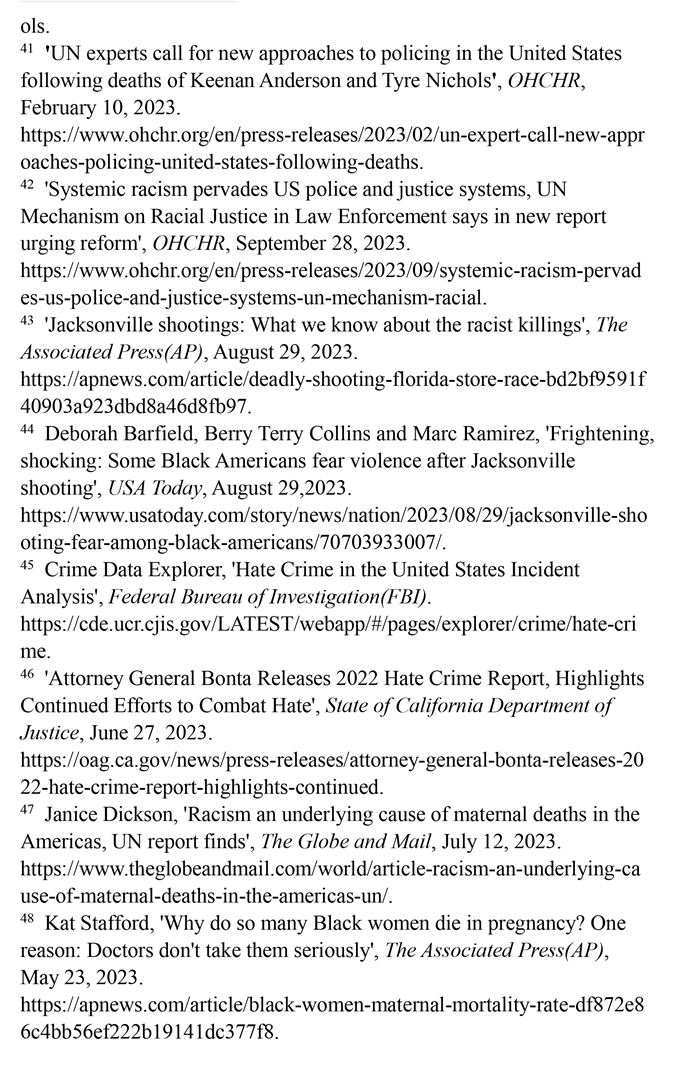非洲裔在執(zhí)法領域面臨嚴重種族歧視。2023年1月3日,洛杉磯31歲的非洲裔男子基南·安德森涉嫌交通肇事,警方在制服他的過程中使用電擊槍擊中其6次,致其心臟病發(fā),送醫(yī)不治身亡。(注39)2023年1月7日,田納西州孟菲斯市的警察以“魯莽駕駛”為由將29歲的非洲裔男子泰爾·尼科爾斯攔下,并對其進行長達數(shù)分鐘的殘忍毆打。三天后尼科爾斯因傷勢過重去世,而事后的調(diào)查無法證實警察關(guān)于其“魯莽駕駛”的說法。(注40)這兩起非洲裔遭受警察暴力執(zhí)法身亡案例引發(fā)多名聯(lián)合國專家的高度關(guān)注。專家們強調(diào),在兩起事件中,警察使用的武力違反保護生命權(quán),禁止酷刑和其他殘忍、不人道或有辱人格待遇或處罰的國際準則,也不符合聯(lián)合國《執(zhí)法人員行為守則》和《執(zhí)法人員使用武力和火器的基本原則》。(注41)聯(lián)合國人權(quán)理事會在執(zhí)法工作中推進種族正義和平等的國際獨立專家機制在對美國實地訪問后發(fā)布報告指出,針對非洲裔的系統(tǒng)性種族主義已經(jīng)滲透到美國警察隊伍和刑事司法系統(tǒng)。非洲裔被警察殺害的可能性是白人的3倍,被監(jiān)禁的可能性是白人的4.5倍。在每年1000多起警察殺人案件中,只有1%的涉事警察被指控。報告警告說,美國如果不按照國際標準改革警察使用武力的規(guī)則,許多殺戮將繼續(xù)發(fā)生。(注42)
