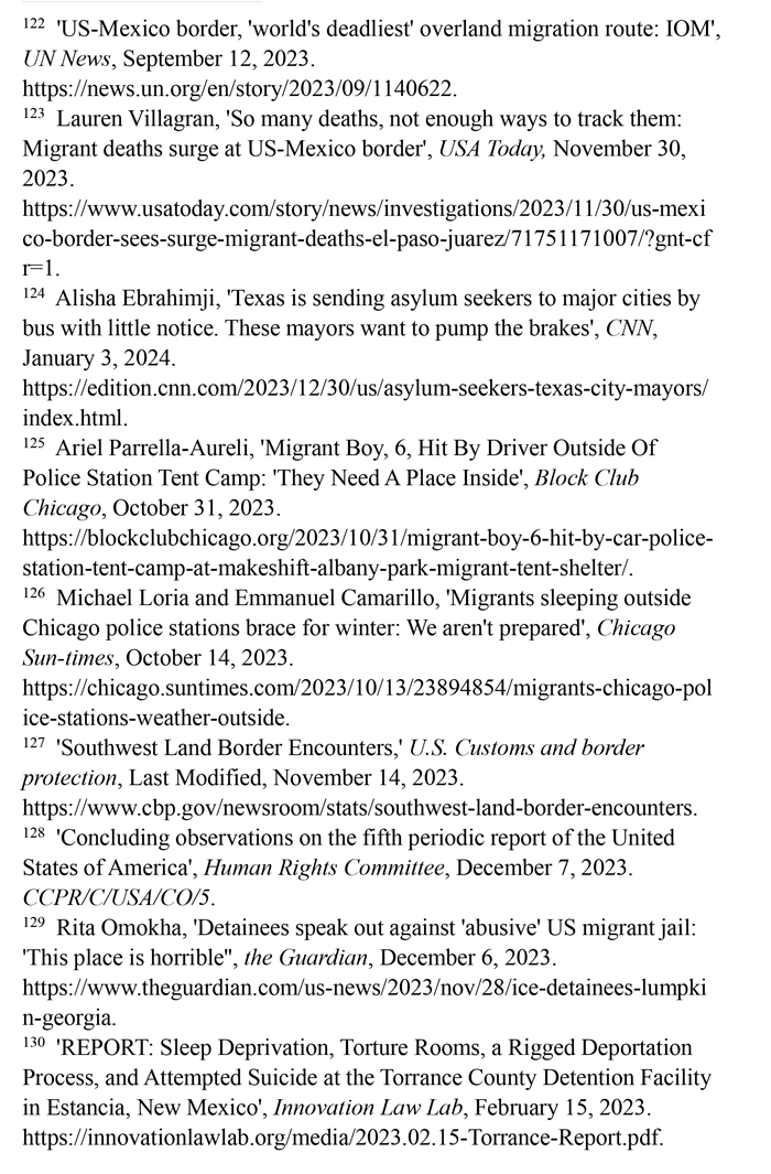 入境移民遭受酷刑及其他不人道待遇。2023財年,在美國南部邊境遭逮捕或驅(qū)逐的移民總數(shù)達240多萬人,再創(chuàng)歷史新高。(注127)聯(lián)合國人權(quán)事務委員會對移民在美國受到長時間的拘留表示擔憂,批評美國的拘留所條件惡劣,人滿為患,被拘押者無法獲得食物、水和醫(yī)療服務,導致包括兒童在內(nèi)的許多人死亡;公共和私營移民拘留設施存在性暴力、長期單獨監(jiān)禁、虐待等侵犯人權(quán)問題。(注128)英國《衛(wèi)報》網(wǎng)站2023年12月6日報道,由美國私人監(jiān)獄公司CoreCivic運營的、位于佐治亞州蘭普金的斯圖爾特拘留中心存在長期單獨監(jiān)禁、性虐待、醫(yī)療疏忽以及強迫勞動等令人擔憂的問題。(注129)創(chuàng)新法律實驗室于2023年2月15日發(fā)布報告揭露,由CoreCivic運營的、位于新墨西哥州埃斯坦西亞的托蘭斯縣拘留所存在對被關(guān)押者實施酷刑現(xiàn)象。在夜間,每隔15分鐘就會有一名警衛(wèi)開著收音機的最大音量走過這些房間,大聲地敲著門,并用手電筒強光照進房間,吵醒任何可能睡著的人。在寒冷的天氣里,每個房間的通風管道整夜都在吹冷空氣。一些人試圖用衛(wèi)生紙或毯子蓋住通風口,但警衛(wèi)們拿走了用來阻擋冷空氣的任何東西。這些牢房里,廁所污水和糞便溢出,人們被迫睡在臭氣熏天的地板上。(注130)