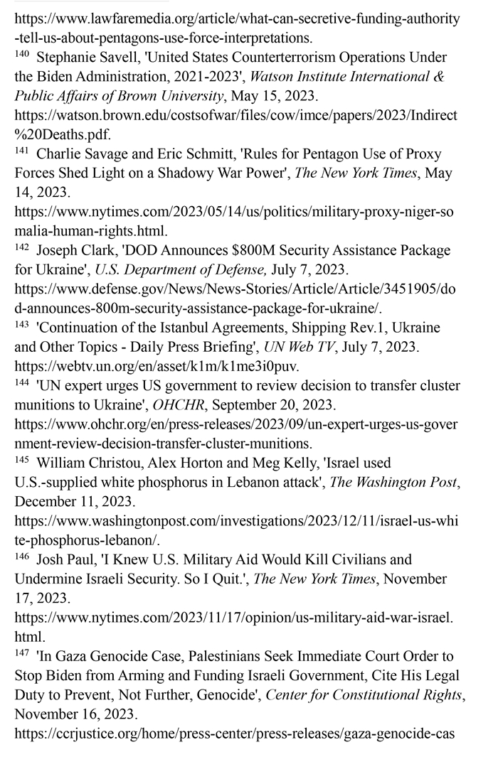 持續(xù)向沖突地區(qū)提供武器。美國國防部2023年7月7日發(fā)布的新聞稿顯示,美國向烏克蘭提供的價值8億美元的額外軍事援助中,包含大量集束彈藥。(注142)聯(lián)合國秘書長副發(fā)言人哈克2023年7月7日回答記者提問時表示,聯(lián)合國秘書長安東尼奧·古特雷斯希望各國遵守《集束彈藥公約》,不要在戰(zhàn)場上繼續(xù)使用集束彈藥。(注143)聯(lián)合國人權(quán)高專辦網(wǎng)站2023年9月20日報道,聯(lián)合國人權(quán)理事會酷刑和其他殘忍、不人道或有辱人格的待遇或處罰問題特別報告員愛麗絲·吉爾·愛德華茲2023年7月向美國政府發(fā)出緊急信函,警告集束彈藥會對平民造成嚴重傷害。(注144)《華盛頓郵報》網(wǎng)站2023年12月11日報道,美國每年流入以色列的軍火達數(shù)十億美元,以色列在10月對黎巴嫩南部的一次襲擊中使用了美國供應的白磷彈藥,造成至少9名平民受傷。(注145)美國國務院政治軍事事務局前局長喬希·保羅2023年10月18日在《紐約時報》網(wǎng)站發(fā)表專欄文章指出,美國每年向以色列提供至少38億美元軍事援助,加沙地帶最嚴重的人員傷亡大多是由美國提供的彈藥所導致,譴責這種軍事援助無視人權(quán)問題。(注146)美國人權(quán)組織“憲法權(quán)利中心”2023年11月16日報道,滅絕種族與死刑問題專家威廉·沙巴斯指責美國未能履行防止種族滅絕的法律義務,違反了習慣國際法和《防止及懲治滅絕種族罪公約》。(注147)