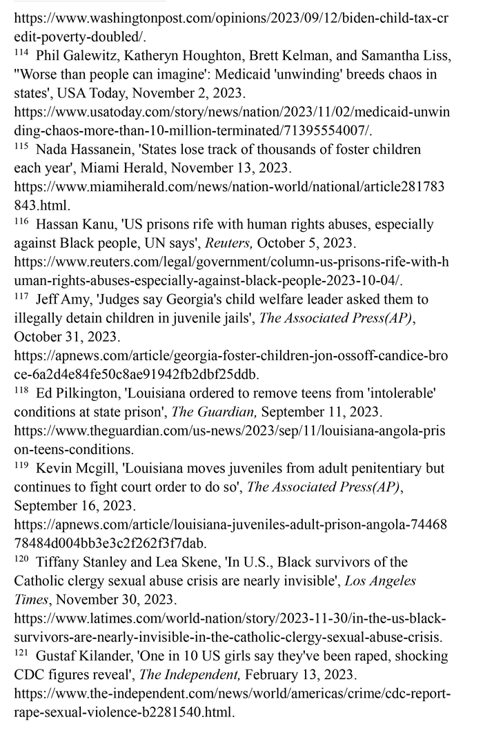 兒童貧困人口激增。美國人口普查局2023年9月發(fā)布的報告顯示,2022年美國貧困人口激增(注112),又有500多萬兒童陷入貧困,兒童貧困率翻了一番多。這是有記錄以來,兒童貧困人口的最大年度增幅。其中一個重要原因是美國政府取消了兒童稅收抵免計劃,使兒童再次陷入貧困。(注113)