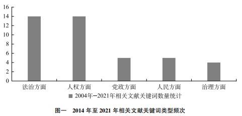 通過對以上關鍵詞進行分析,可將意義較為顯著的關鍵詞按照詞頻排序大致分為以下幾類:第一,法治相關,如依法治國、憲法權威、法治中國、習近平法治思想等。第二,人權相關,人民利益、如人權保障、人權理念、人權特色、人權路徑等。第三,黨政相關,如黨的領導、黨法關系、中國共產(chǎn)黨、政治制度等。第四,人民相關,如人民當家作主、以人民為中心、以人為本等。第五,治理相關,如國家和社會治理、治國理政、良法善治和國家治理等。此外,還零散涉及了諸如中國夢、人類命運共同體、全面建成小康社會(具體見圖一)。