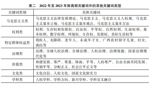 值得注意的是,除以上關鍵詞之外,另有部分關鍵詞雖未使用完全相同的表述,但從宏觀上可將其劃歸為同一研究范疇,因此,為全面展示2022-2023年主要的研究內(nèi)容,筆者對這些關鍵詞予以初步類型化,其大致分布在以下幾個方面:一是馬克思主義類,如馬克思主義、馬克思主義人權觀、馬克思主義基本立場、馬克思主義基本方法等。二是權利類,如生命權利、生存權、發(fā)展權、環(huán)境權等。三是特定群體權益類,老年人、殘疾人、婦女、未成年子女等。四是治理類,如國家治理效能、全球治理、人權治理、國家治理現(xiàn)代化等。五是價值類,如和諧發(fā)展、尊嚴、尊重、體面等。六是文化類,如文化自信、人權文化、國家文化軟實力。七是學科類,如人權學科、學科方向、新興學科、學科交叉融合(具體見表二)。